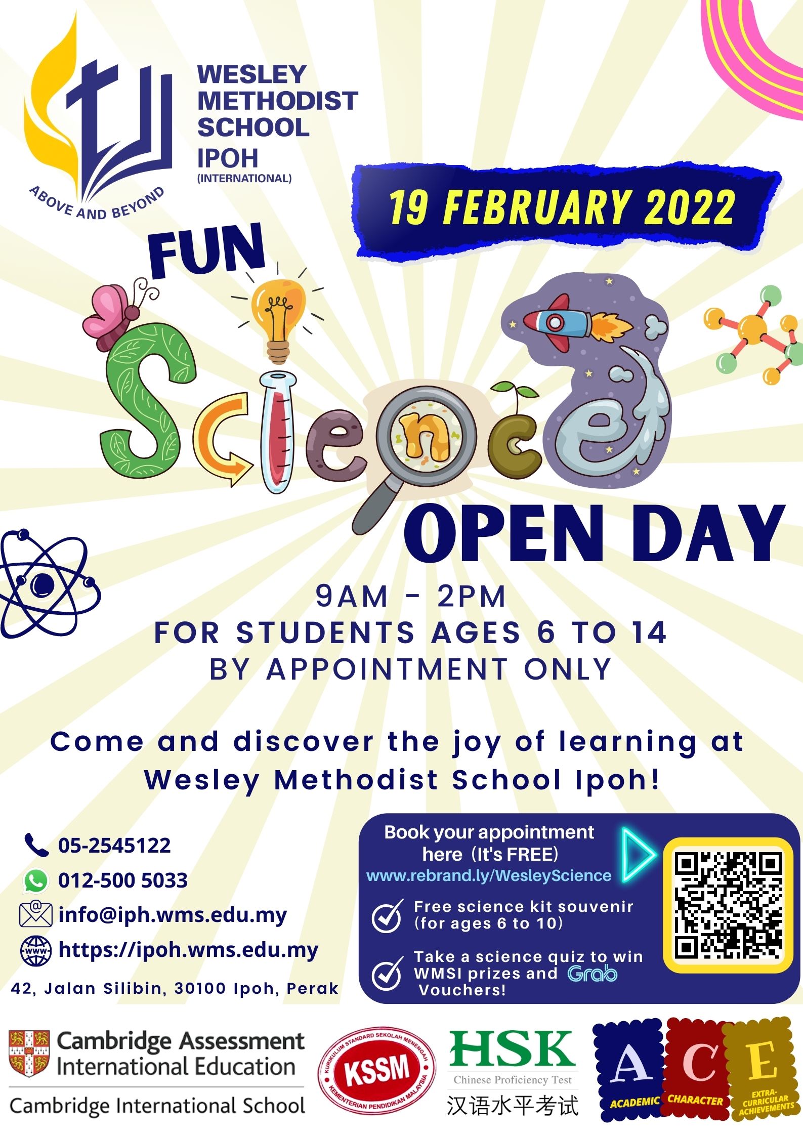 Bring your child to explore and discover how WMSI teachers nurture and guide them to reach their full potential. Conduct fun science experiments and take a simple fun science quiz to win WMSI prizes and GRAB Vouchers! Free science kit souvenirs available (for ages 6 to 10) Claim 50% off your application fee and registration fee when you join us on our Fun Science Open Day!